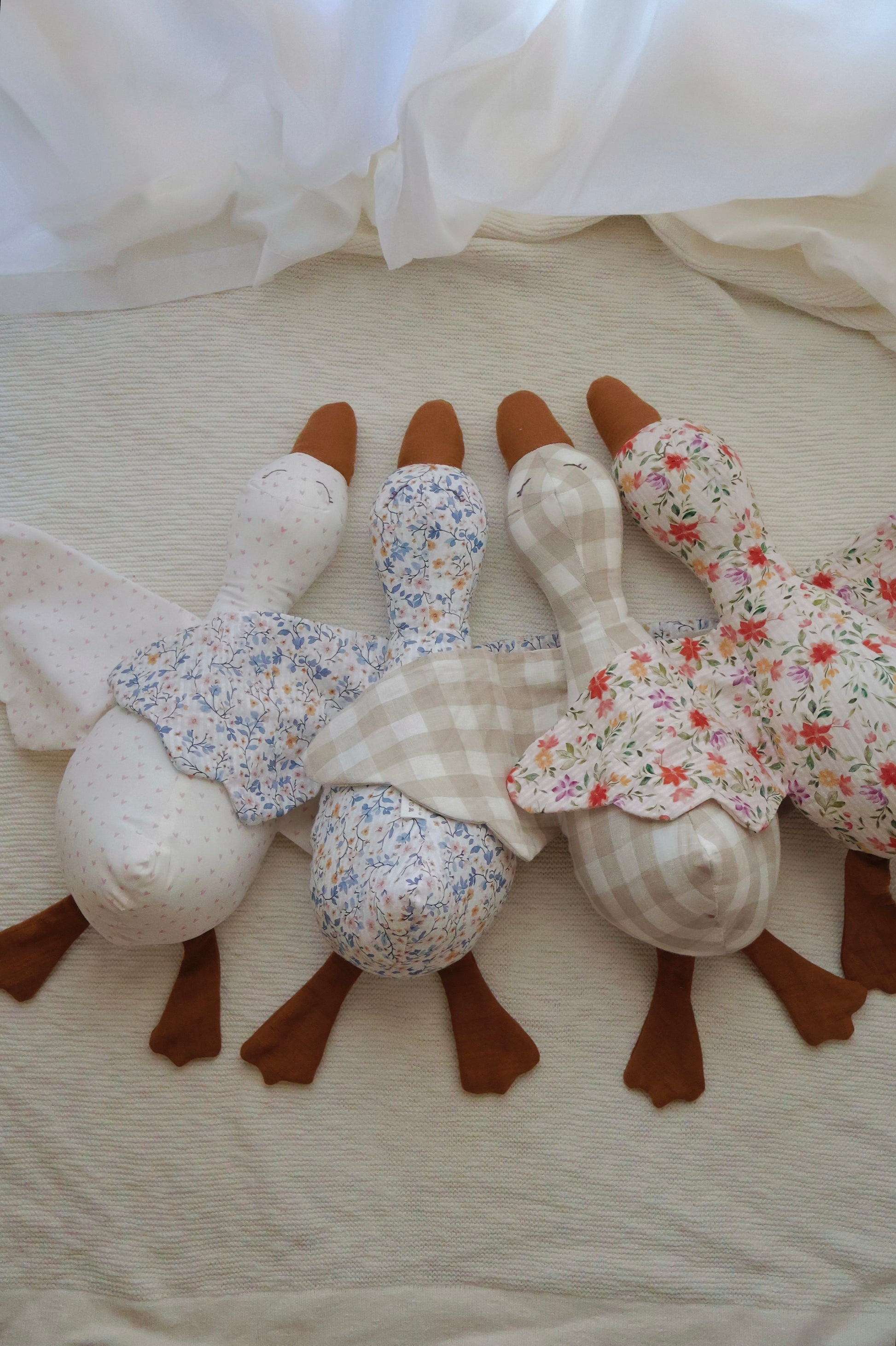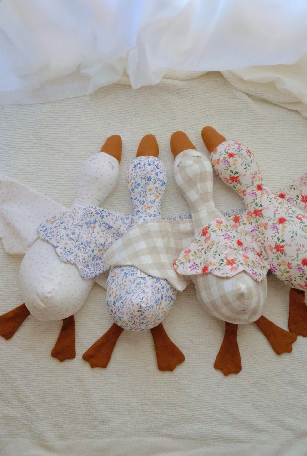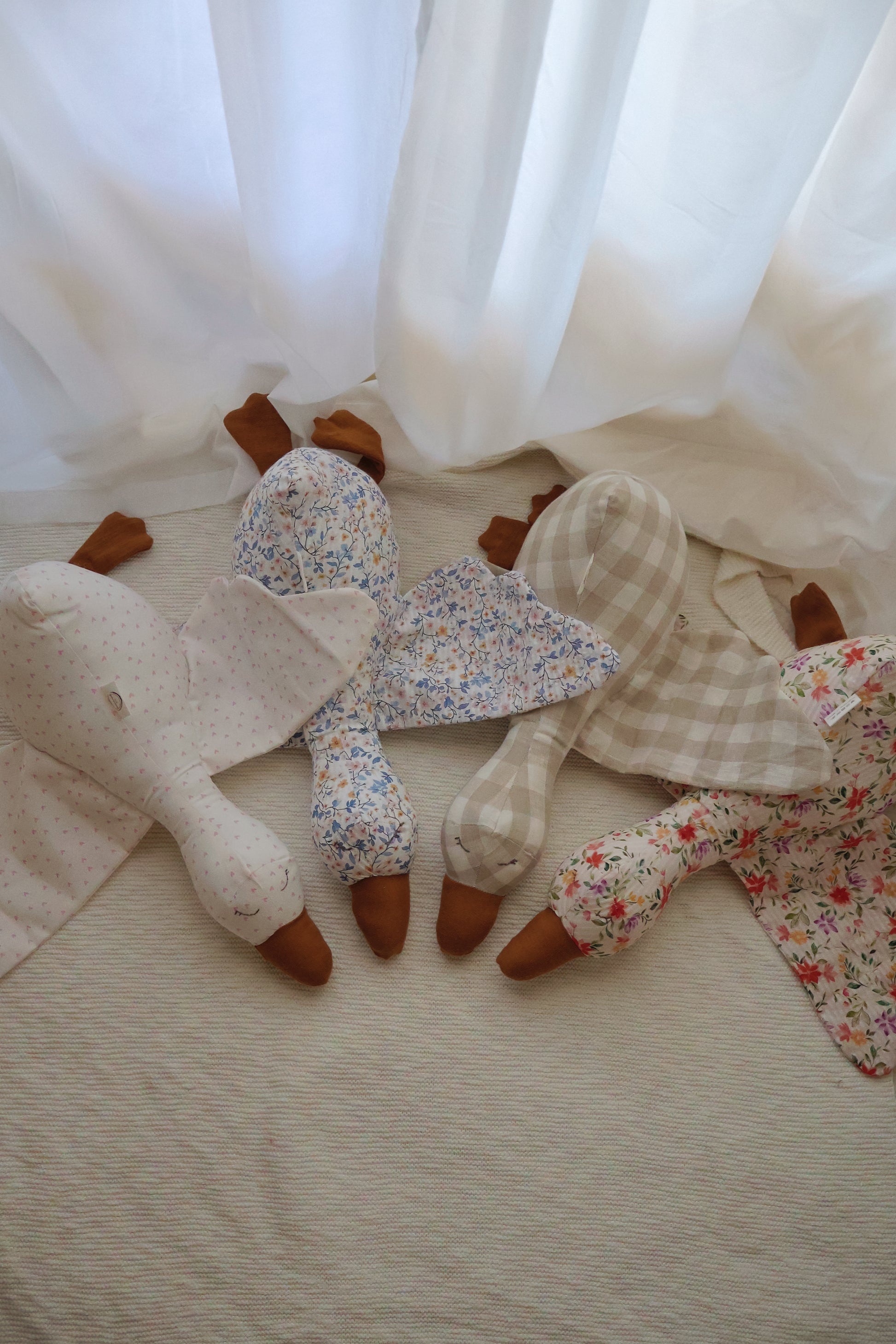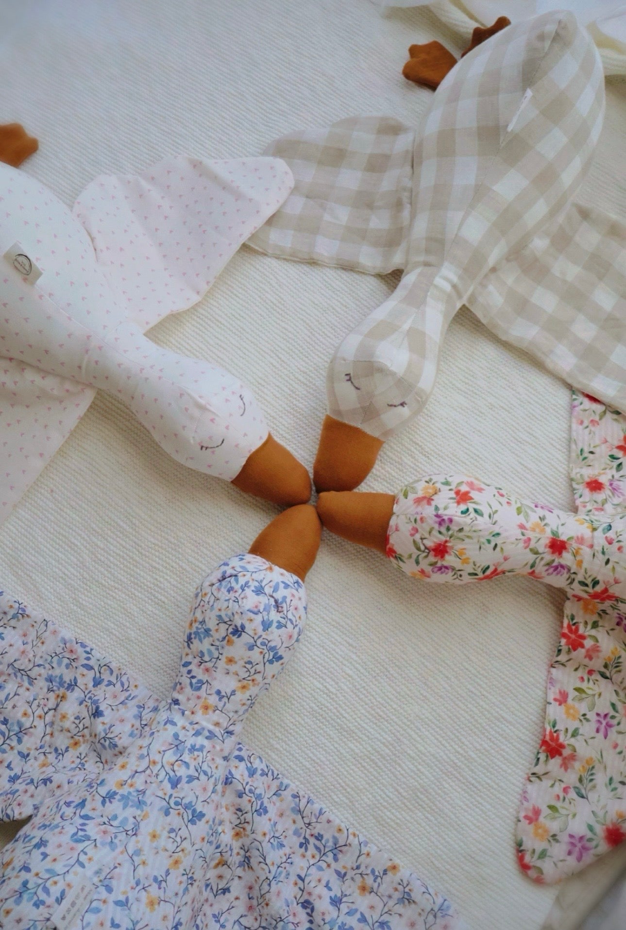 Each duck features delicate floral and gingham fabrics, soft earthy tones, and a timeless design that feels both nostalgic and sweet. Created to be cuddled, carried, and loved, these ducks are perfect for nursery styling, gentle play, or as a meaningful keepsake for your little one.
