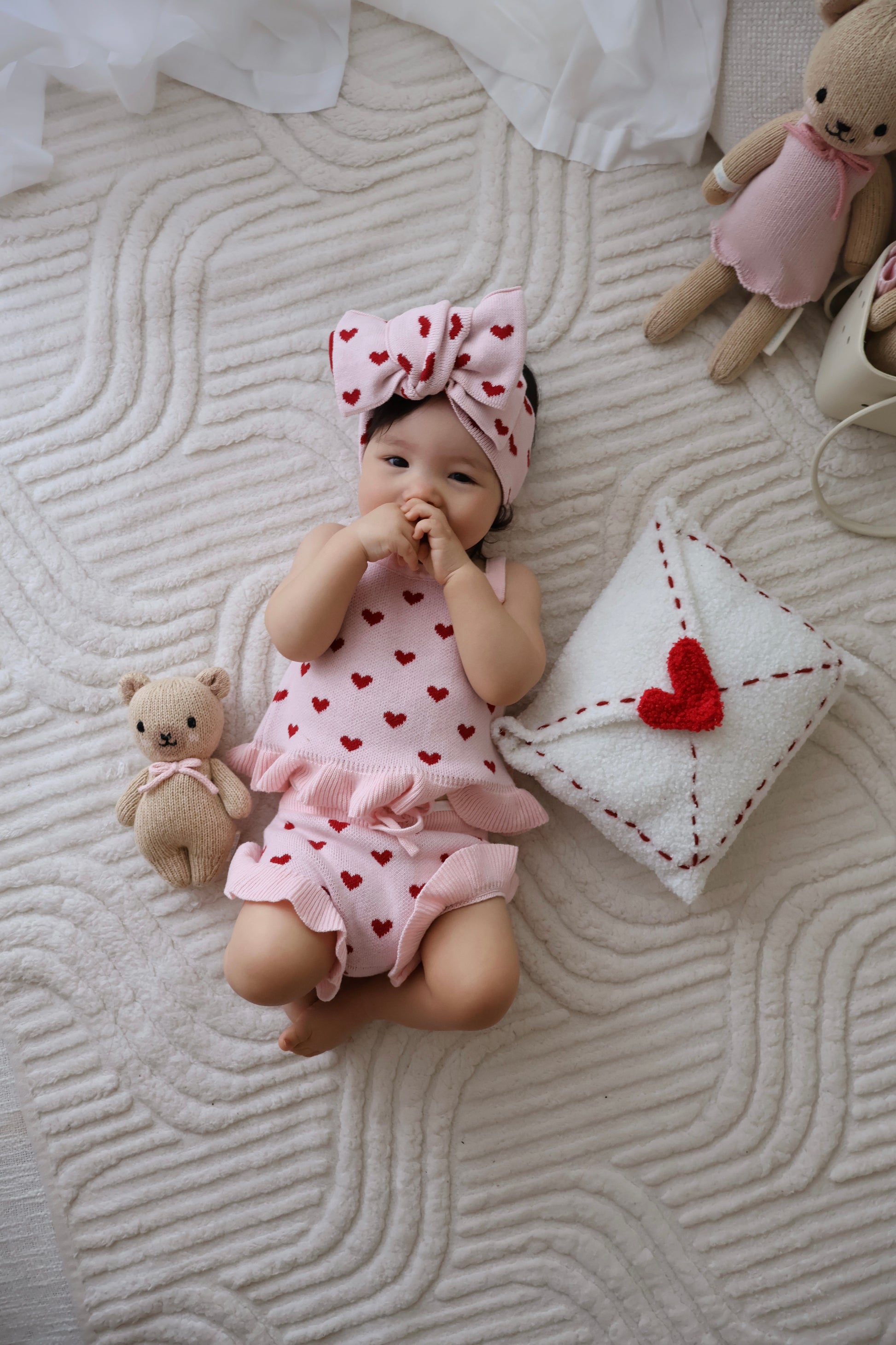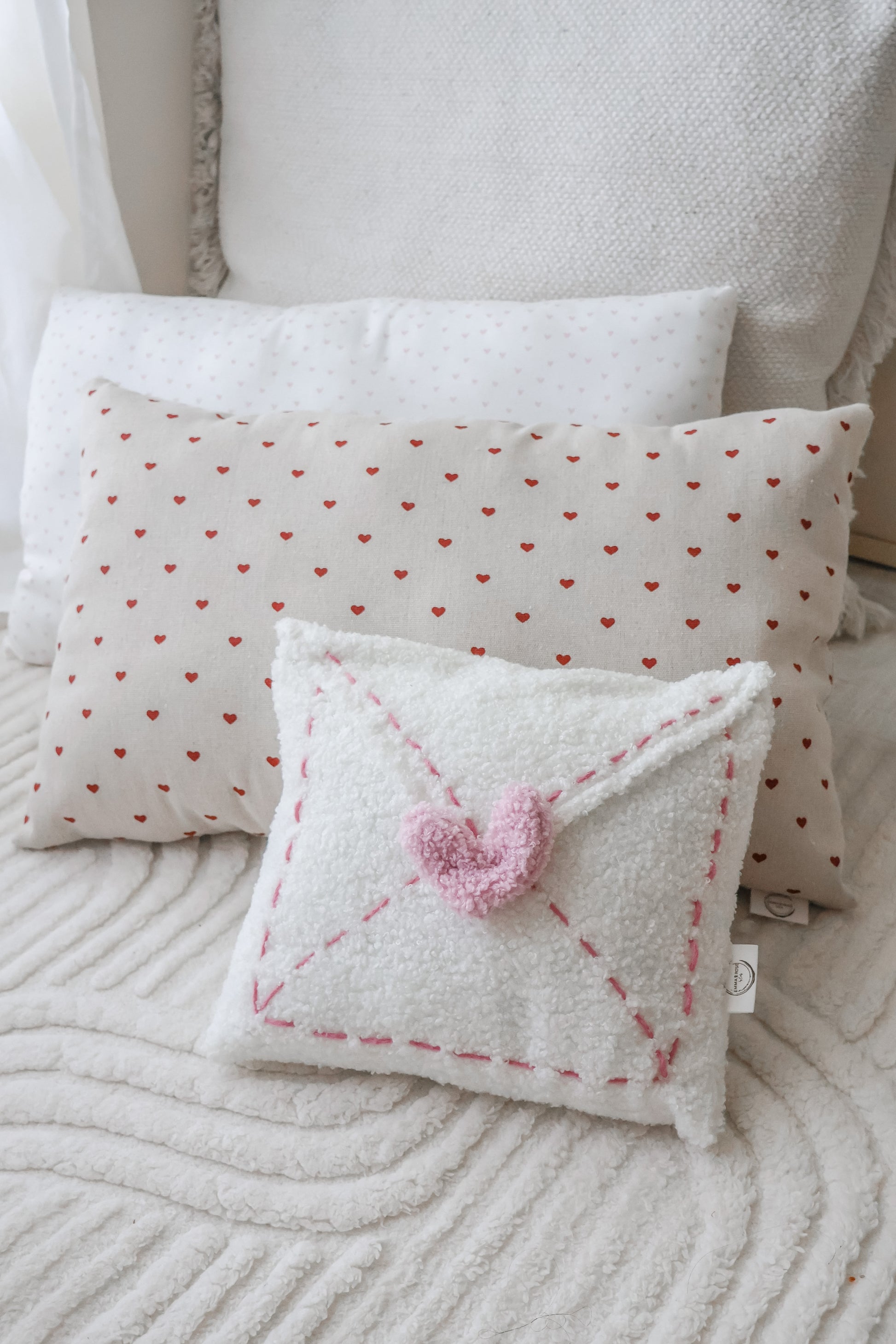 Designed in an envelope silhouette with delicate hand-stitched details and a soft plush heart, available in red and pink.